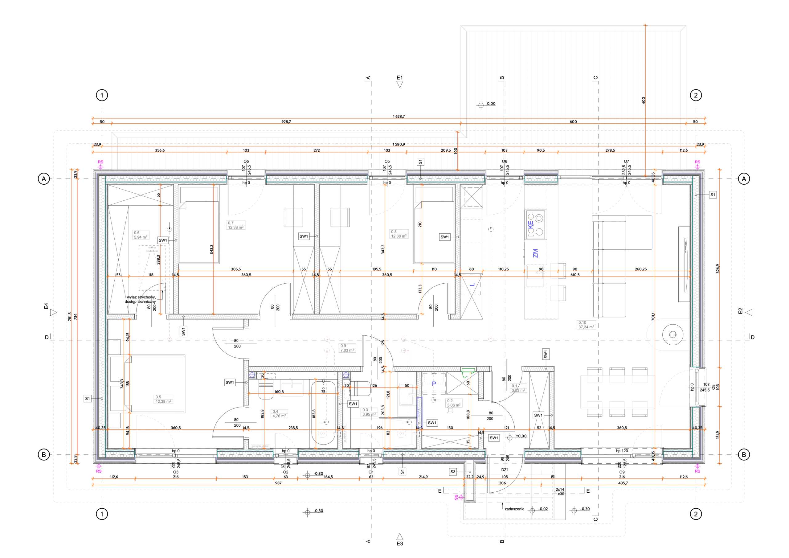 Główną izolacją domu jest wełna mineralna lub zamiennie wdmuchiwane włókno drzewne – Steico Zell. Dom jest dodatkowo ocieplony płytami termoizolacyjnymi Steico.